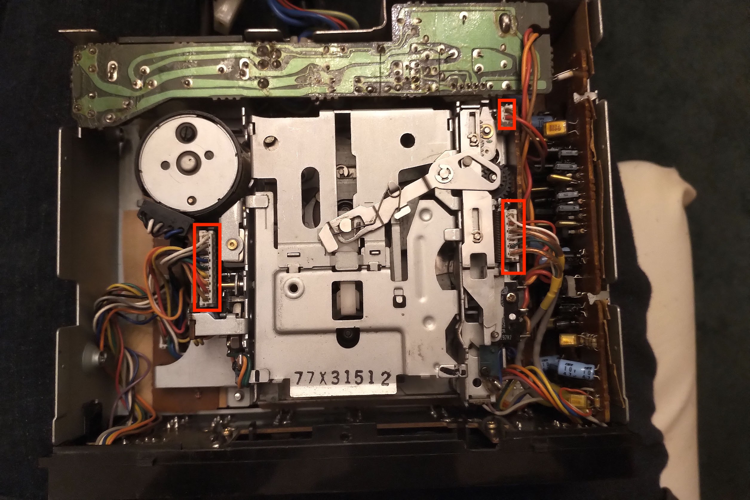 Disconnect the connectors I've highlighted here on the mechanism.