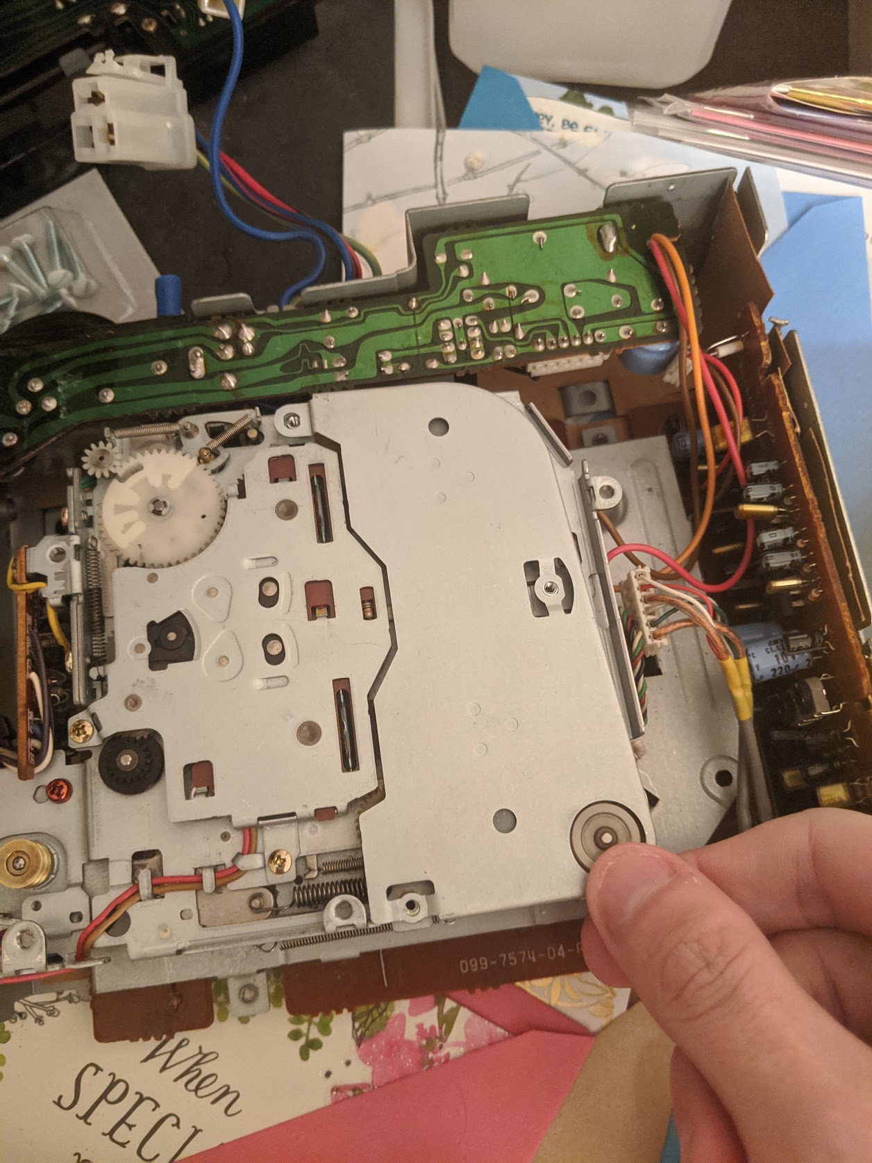 Great, now the mechanism should be free. It still is attached to the logic board, so make sure not to yank the wires off! Just carefully lift it out of its chassis and on to the table beside it.